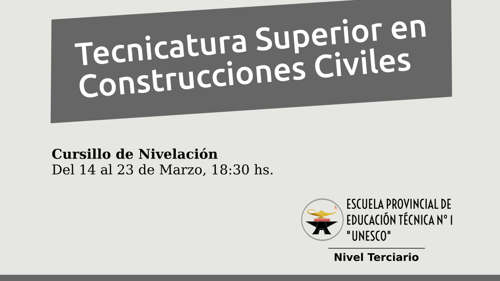 La Tecnicatura Superior en Construcciones Civiles informa que desde el 14 y hasta el 23 de Marzo se llevará a cabo el cursillo de nivelación para el presente Ciclo Lectivo.