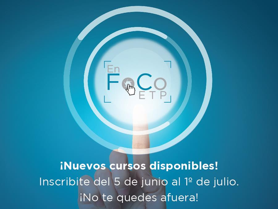 NoticiasDesde el 5/6 inscribite a los cursos de En FoCo ETP DRodriguez / 1 junio, 2018 El programa En FoCo ETP invita a seguir construyendo la Educación Técnica del futuro.