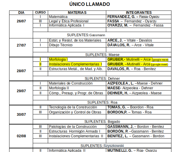 Mesas de Examen Ciclo Básico A los alumnos que rinden 1° Dibujo Técnico, 2° Dibujo Técnico, 1° Matemática, 2° Matemática,