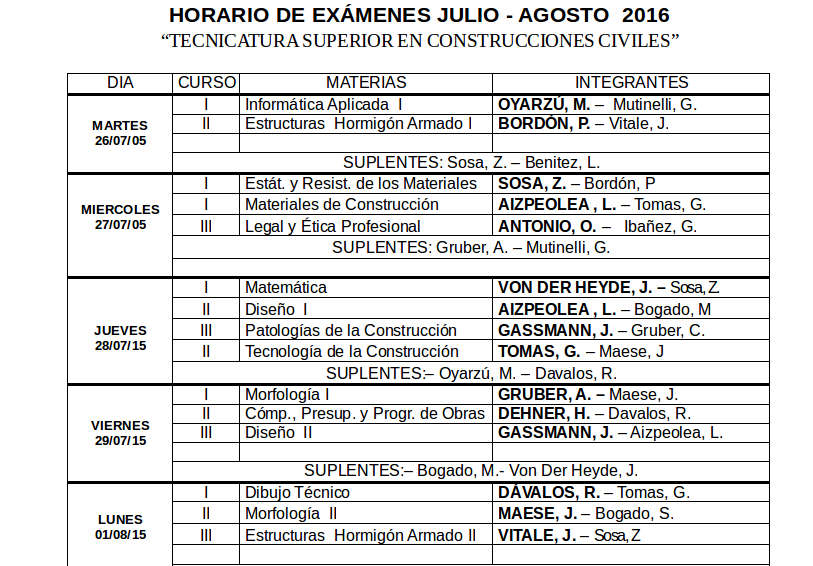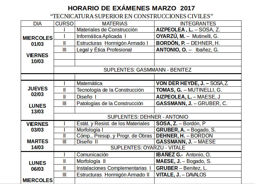 Exámenes Tecnicatura Superior en Construcciones Civiles Horario de las Mesas: 18:30 hs.